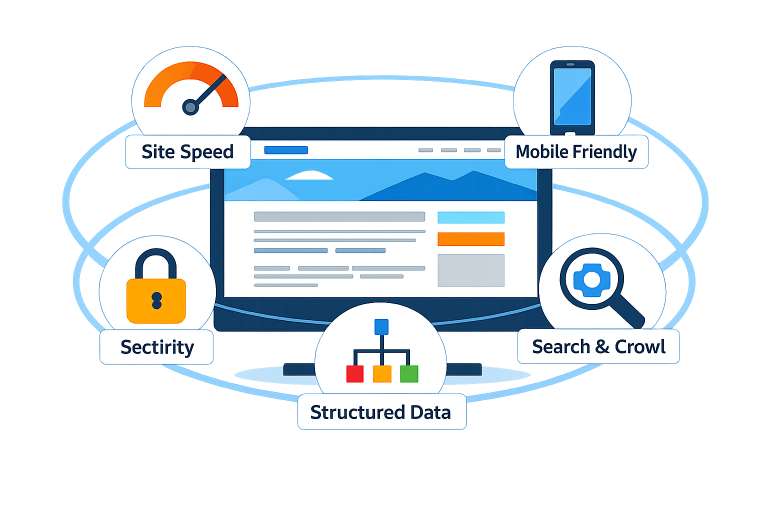 - Vital technical areas include site speed, mobile usability, HTTPS security, structured data, and crawlability.